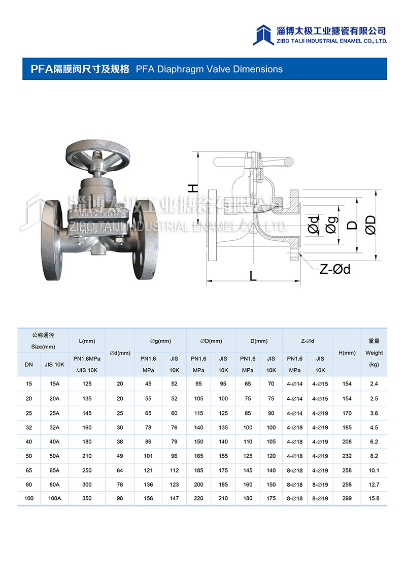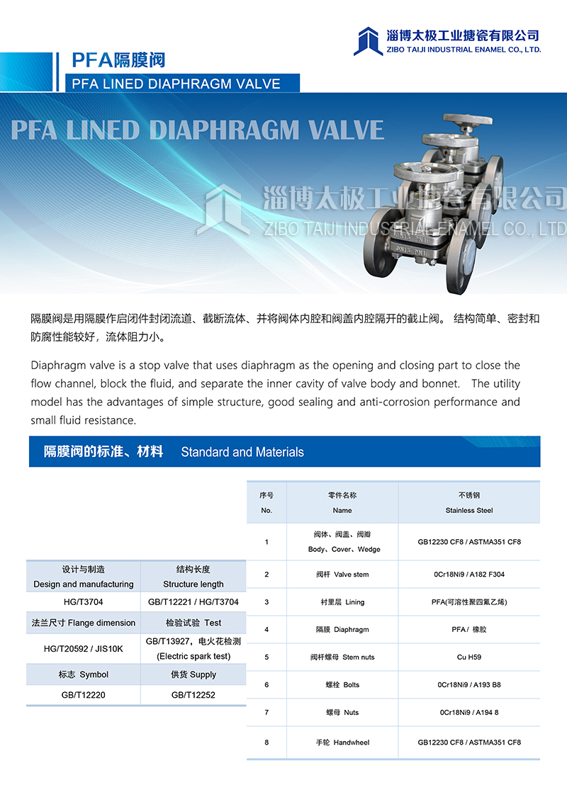 太極氟塑料PFA隔膜閥是用隔膜作起閉件封閉流道、截?cái)嗔黧w、并將閥體內(nèi)腔和閥蓋內(nèi)腔隔開(kāi)的截止閥。結(jié)構(gòu)簡(jiǎn)單、密封和防腐性能較好,流體阻力小。