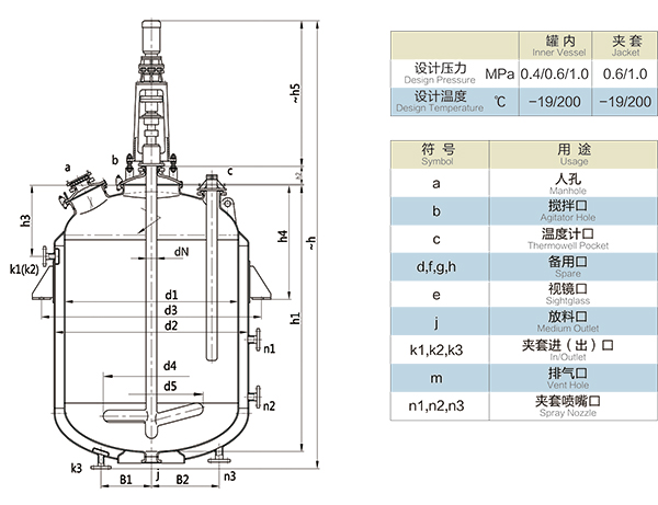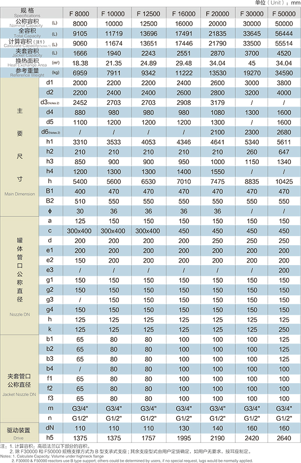 F8000L-F50000L閉式搪玻璃反應釜(閉式搪瓷反應釜)設計圖紙及參數如下所示: