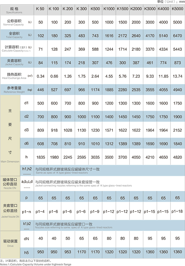 K50L-K5000L電加熱搪玻璃反應釜(電加熱搪瓷反應釜)設計圖紙及參數如下所示: