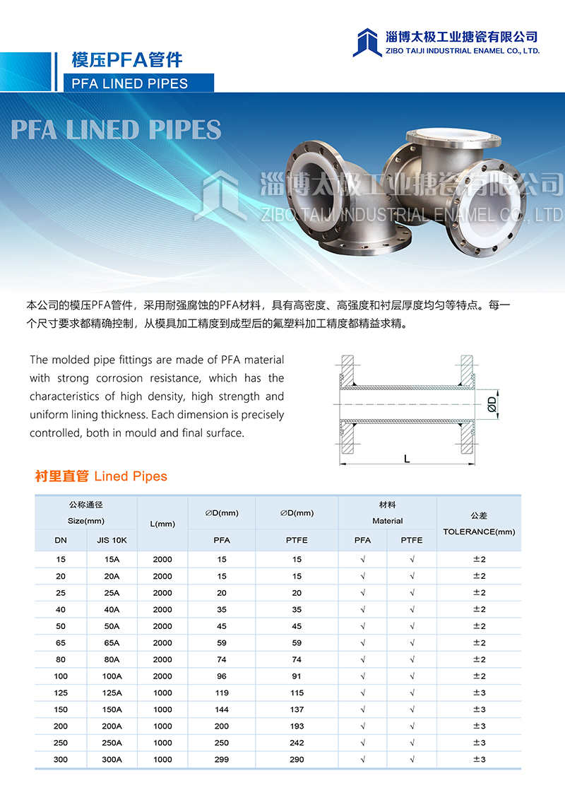 本公司的模壓PFA管件,采用耐強腐蝕的PFA材料,具有高密度、高強度和襯層厚度均勻等特點。每一個尺寸要求都精確控制,從模具加工精度到成型后的氟塑料加工精度都精益求精。
